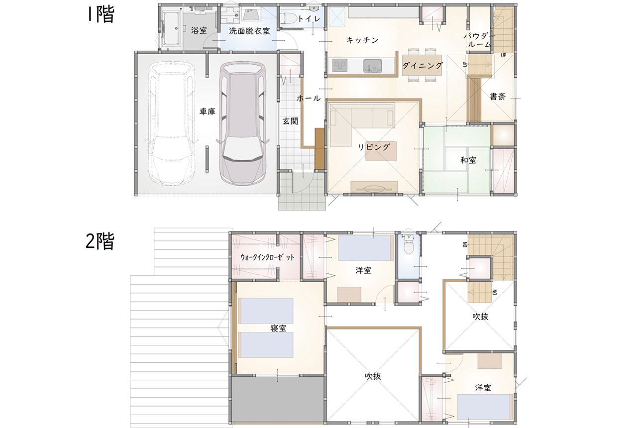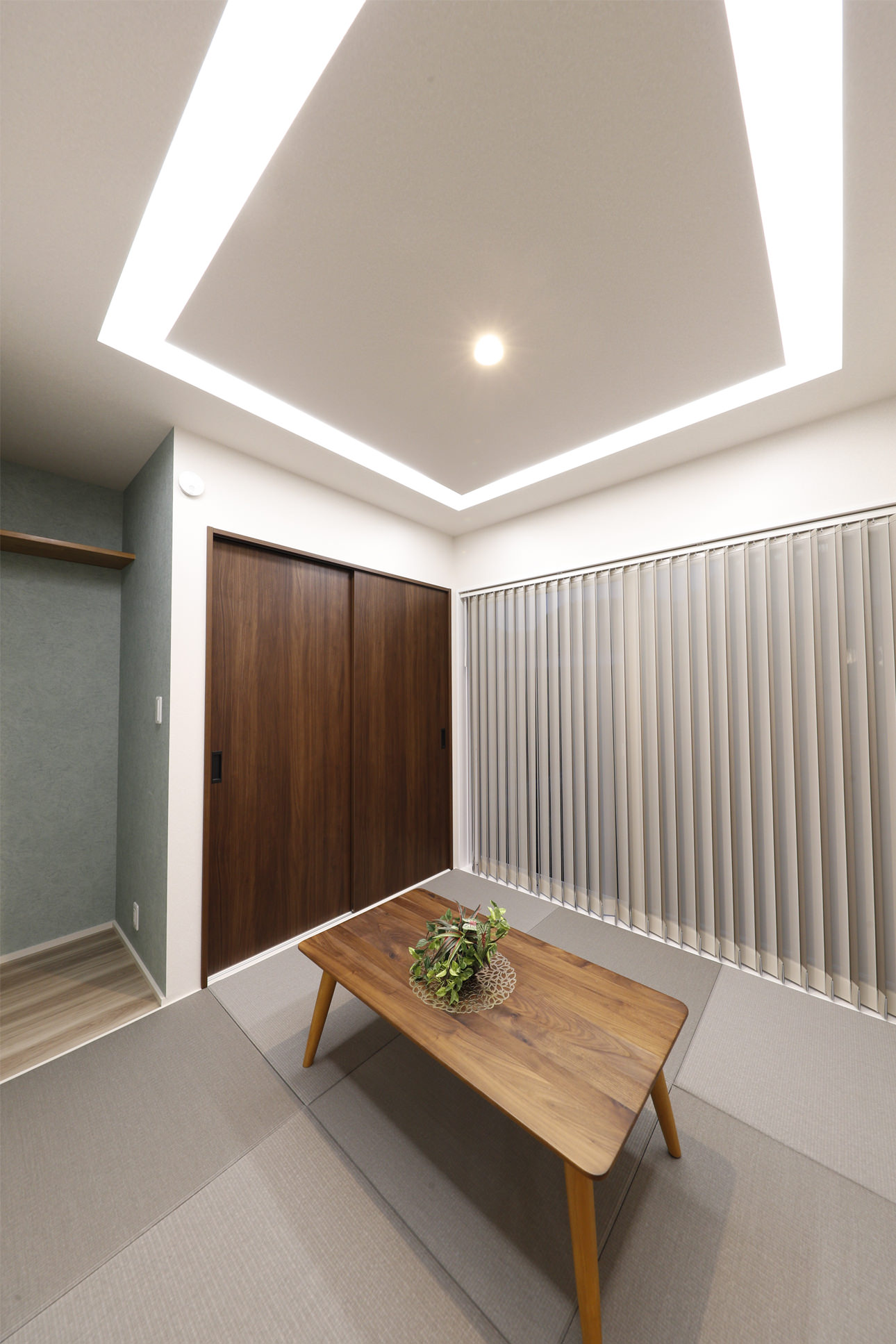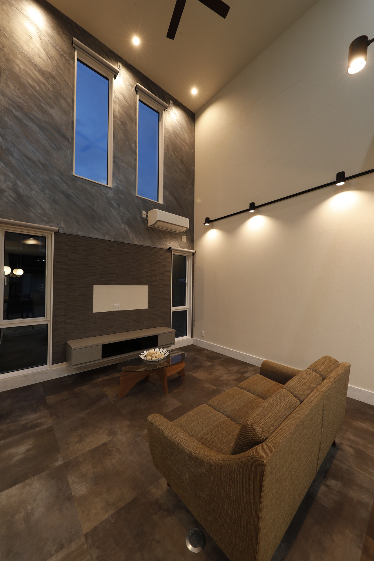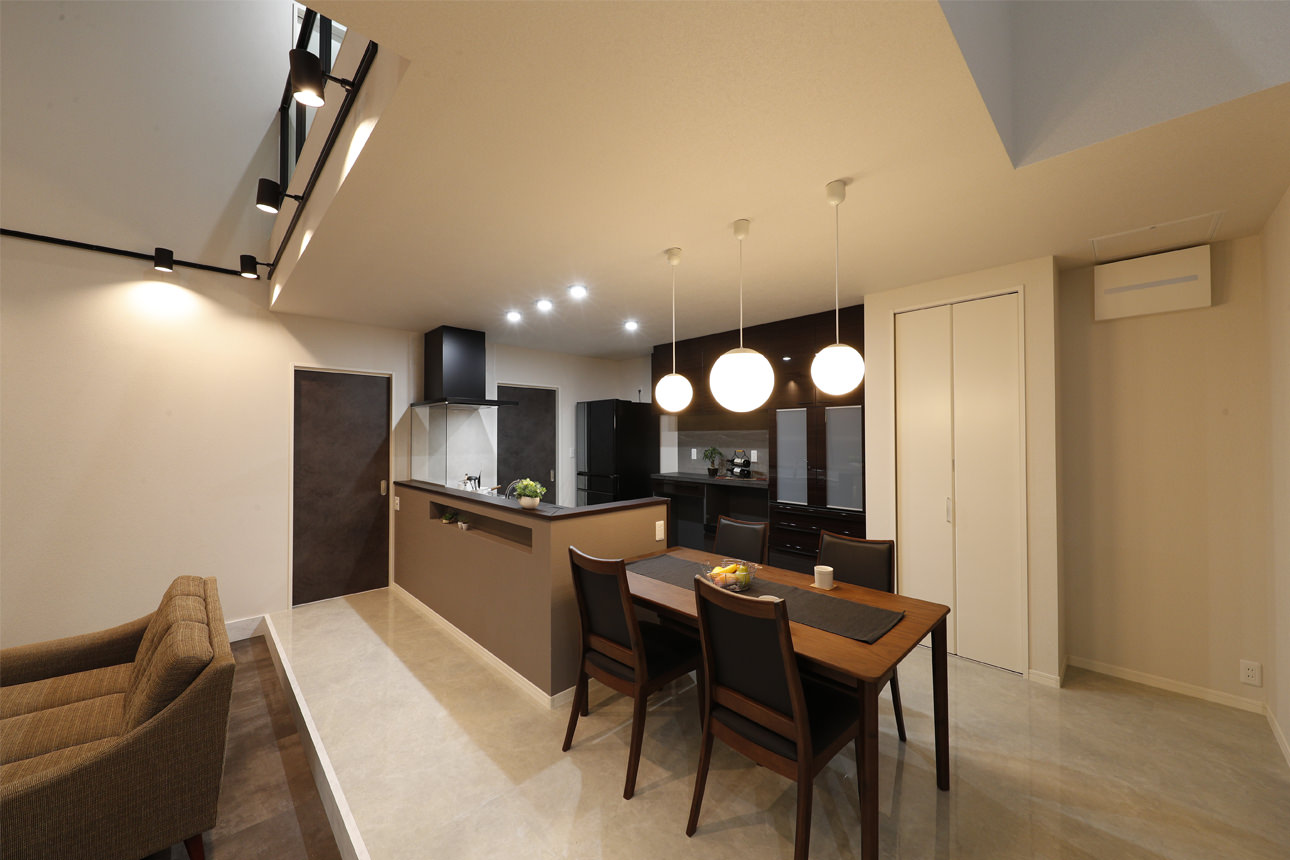 開放的な吹抜け、段差のあるリビング、間接照明で非日常を演出した和室などをプランの中で融合させ、それぞれの空間が違和感なく溶け込めるようなデザインとしました。