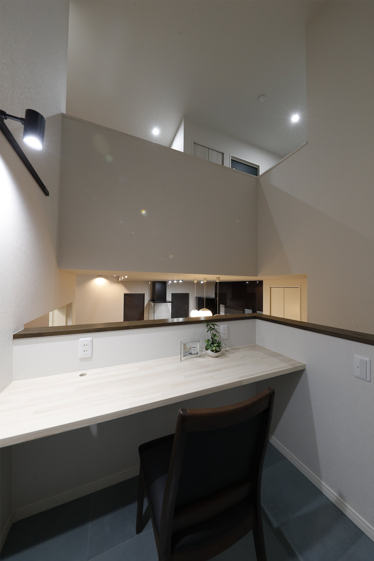 また、全体的に開放的にしましたが、階段途中に書斎スペースを確保したり、階段下にパウダールームを設けたりと、全体を開放的にしながらもパーソナルなスペースを確保し、 家族としてのスペースと個人としてのスペースの使い分けも取り入れています。