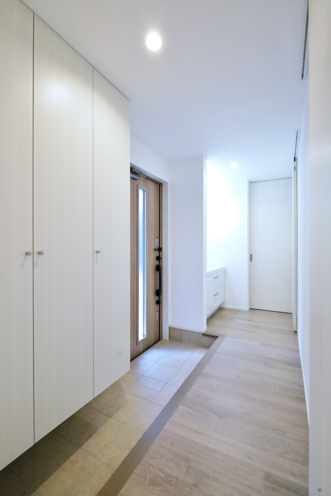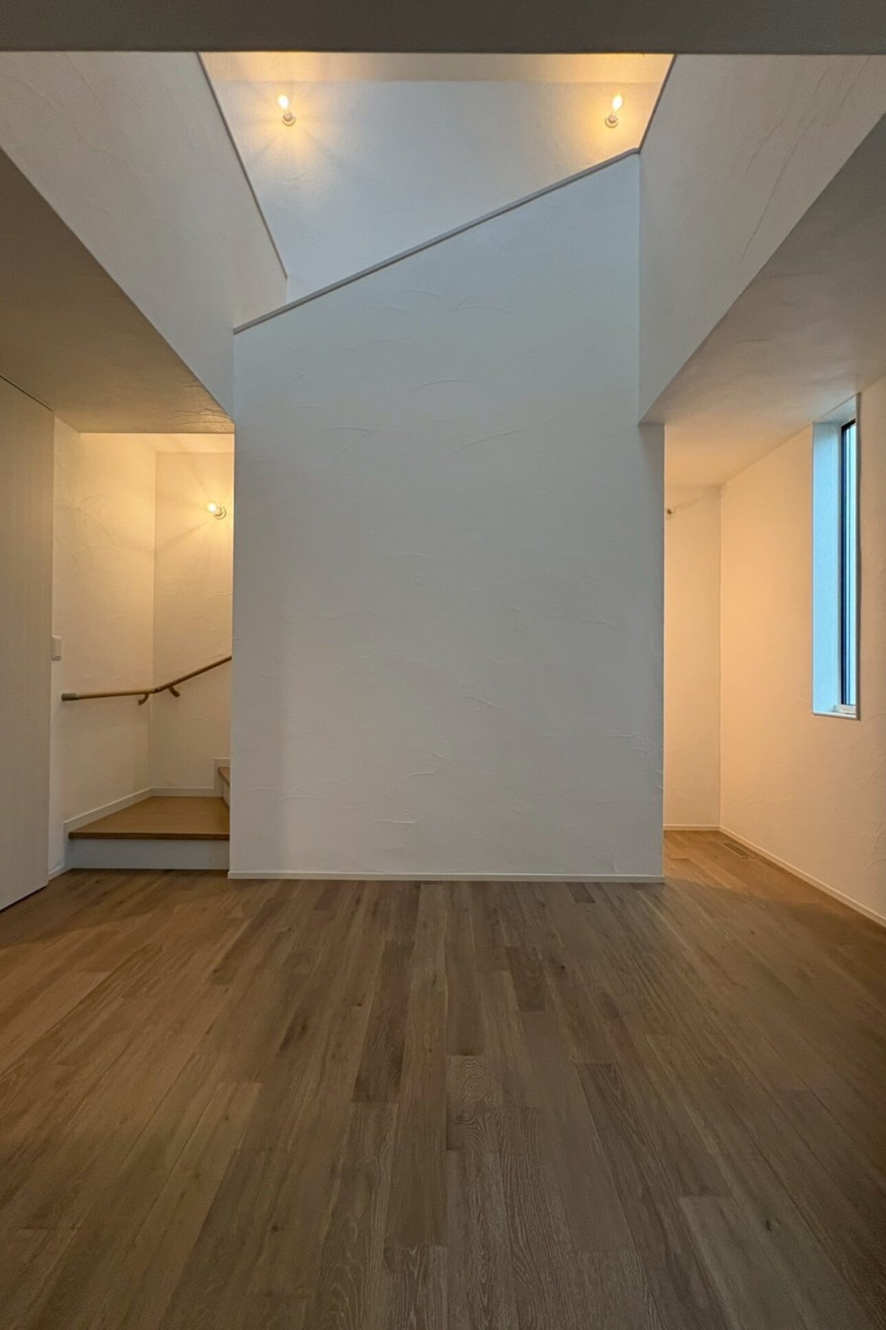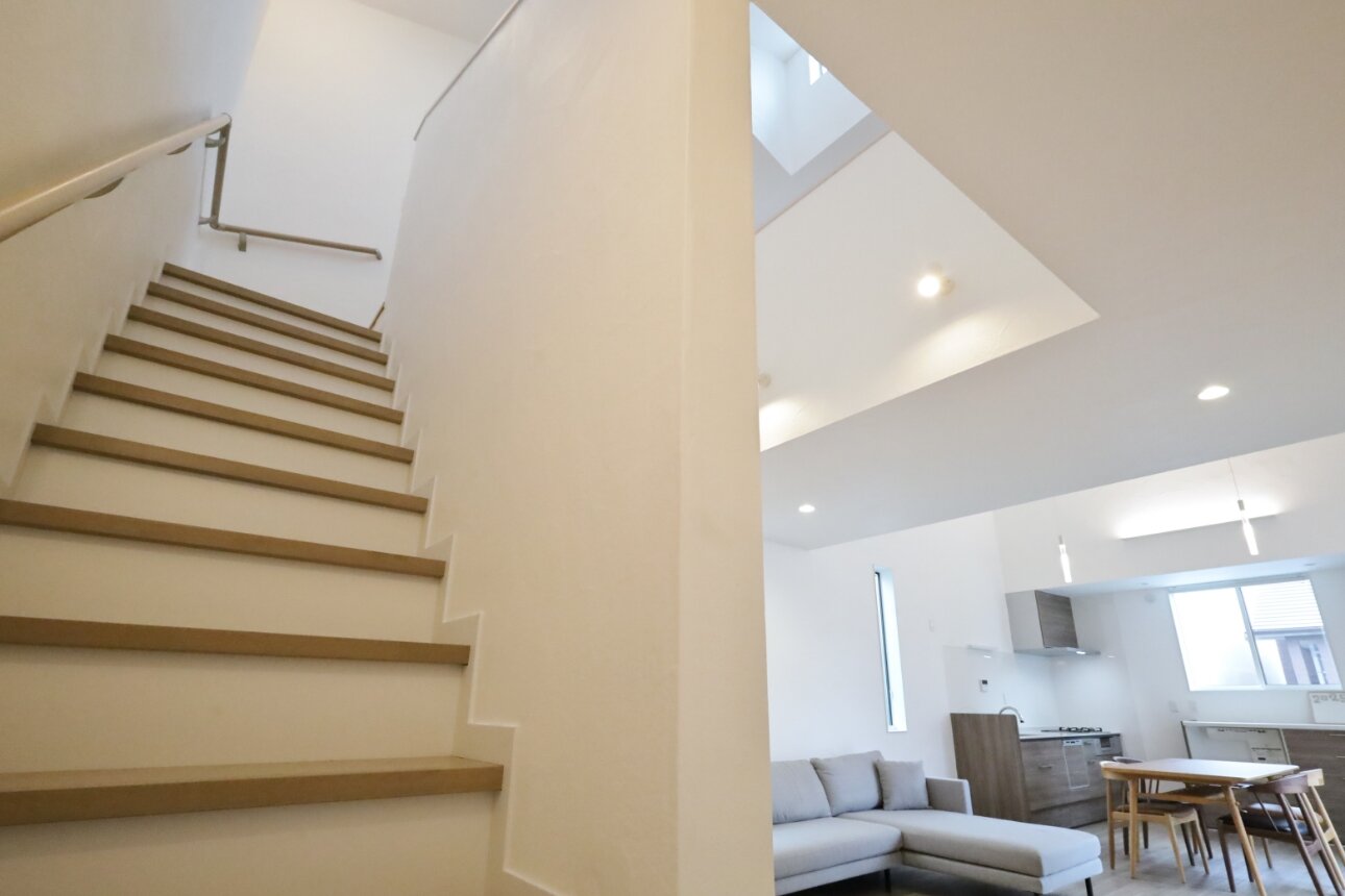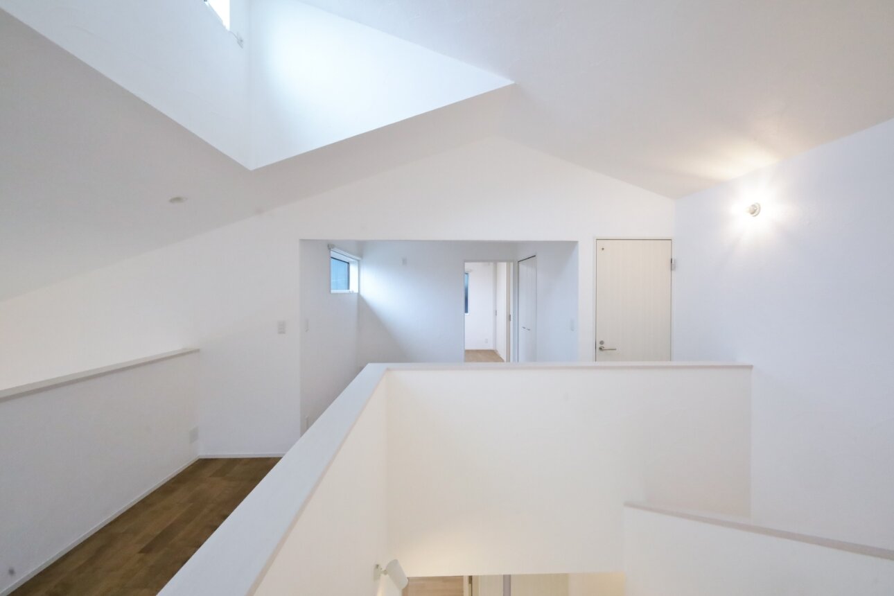 窓から差し込む光は階段の壁にやさしく反射し、まるでステージにスポットライトが当たるように窓の位置や吹抜の配置まで光の演出を計算した設計です。