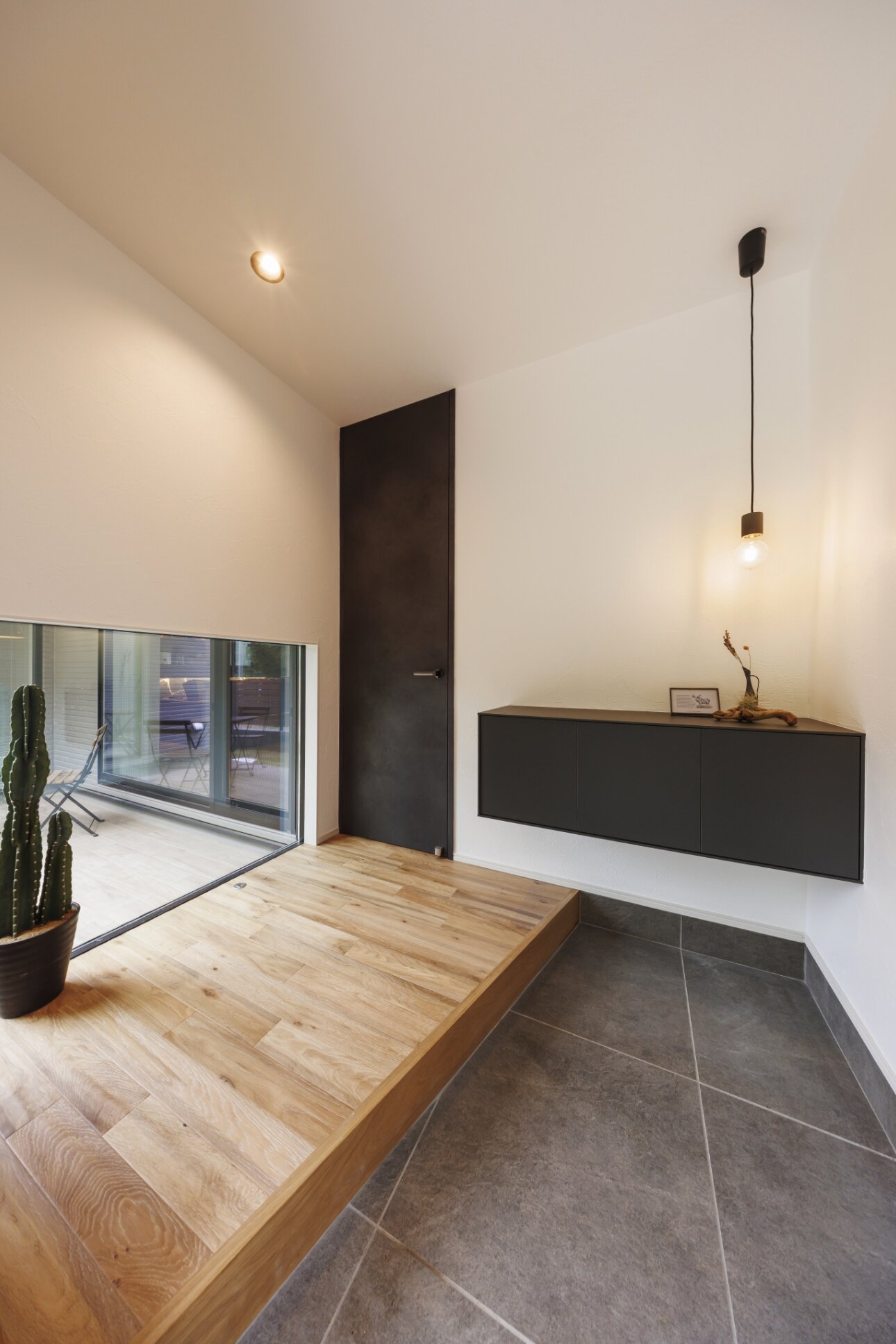コの字に囲われたデッキのあるお庭から繋がるドッグラン、リビング横に設けた愛犬のスペース、玄関には帰ってきた際に愛犬が覗ける窓を設け、どこにいてもご夫婦の大好きな愛犬の存在を感じられます。