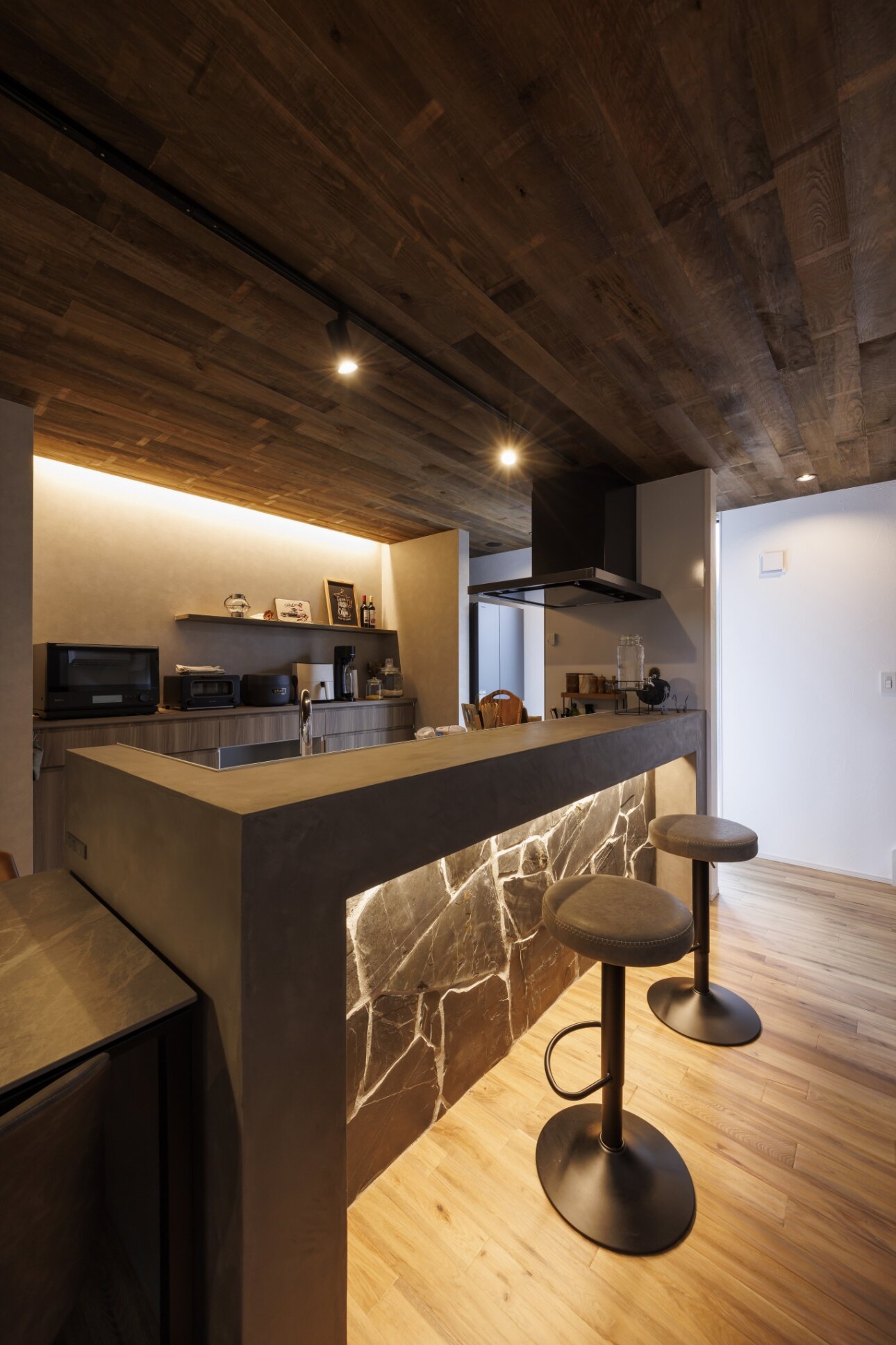 素材にもこだわり、荒々しさの残る古風板を使用したダイニングキッチンの天井と、乱尺石張りのキッチンの腰壁は1番のこだわりです。素材、工業的な照明、飾るインテリアの小物1つ1つまで一緒にこだわりました。