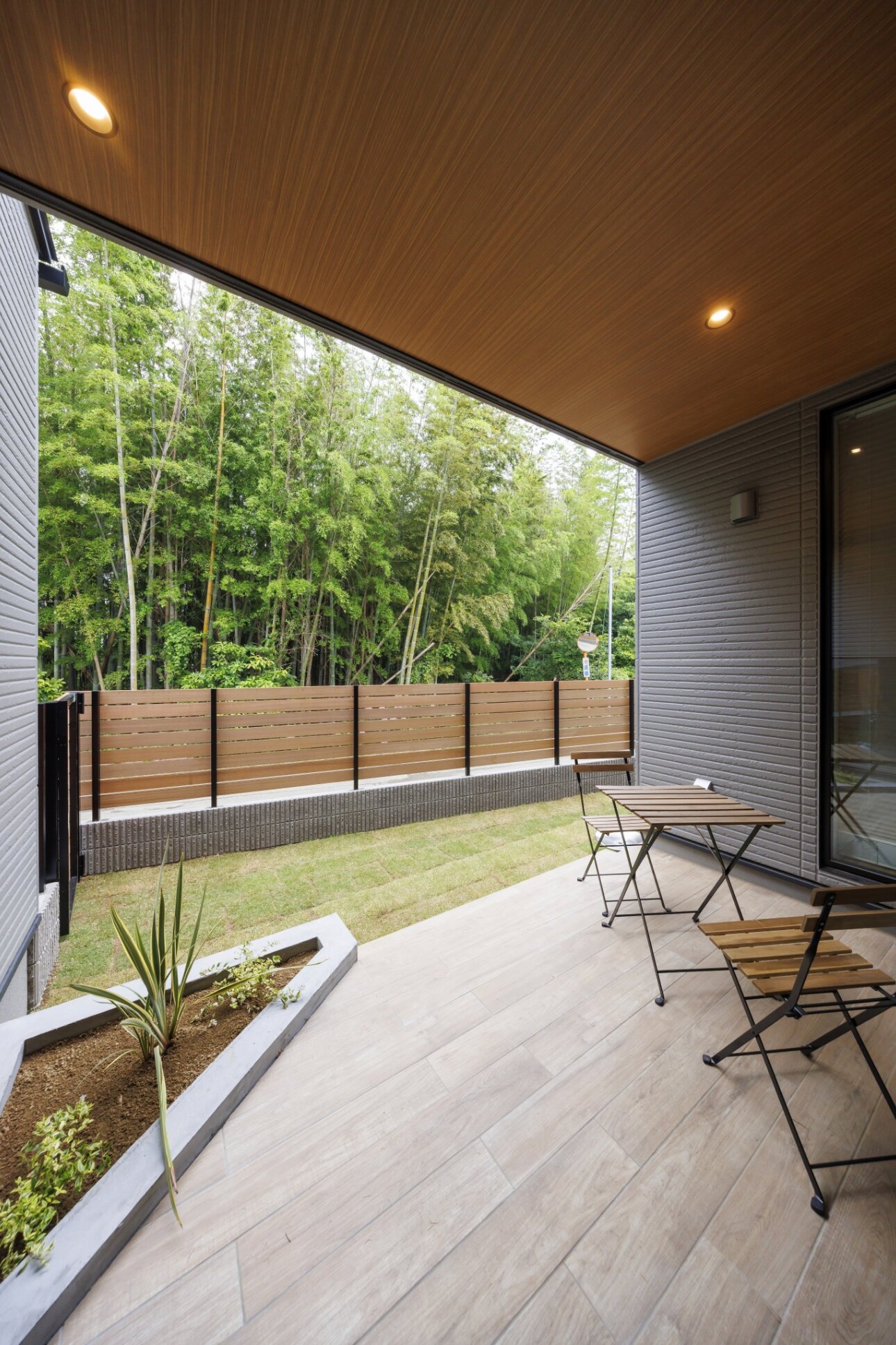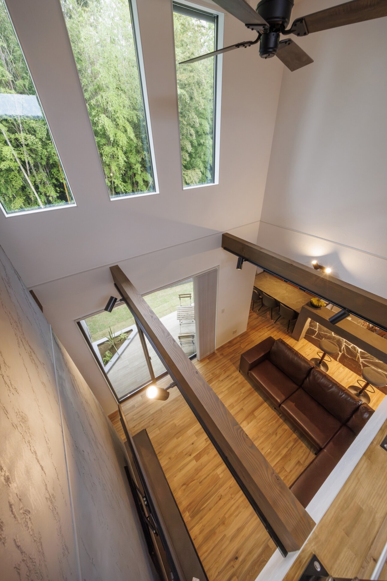 目の前に竹林の見えるロケーションを借景として活かすことで奥行感を感じられます。コの字で囲う中庭と、空中廊下からのダイナミックな吹抜の窓から常に緑を眺められるように。